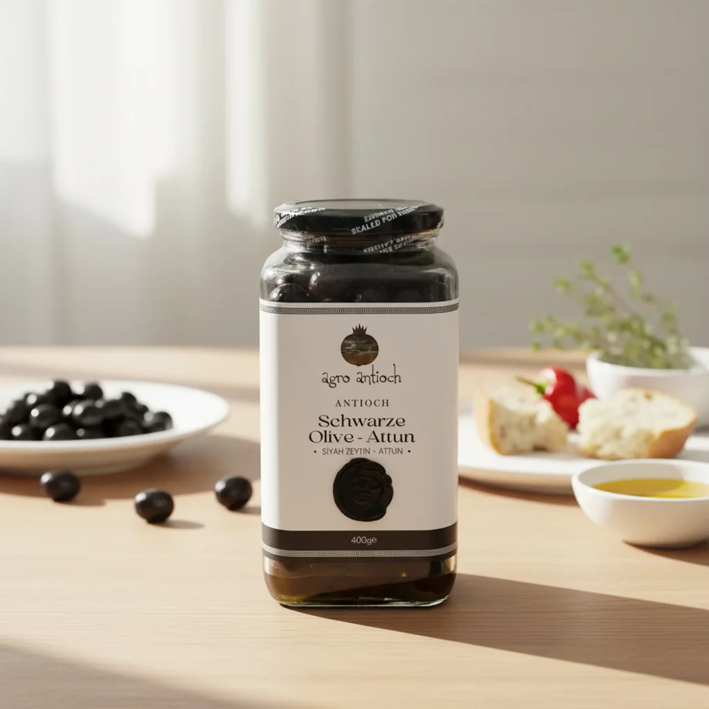 Agro Antioch Attun Olive ist eine der besonderen Olivensorten der Region Hatay. Schwarze, dehydrierte Halhali- und Karamani-Oliven werden in der Saison sorgfältig geerntet, ohne Zusatzstoffe nur mit Salz behandelt und in Salzlake eingelegt. Danach werden sie vom Salz befreit und in Gläser abgefüllt.